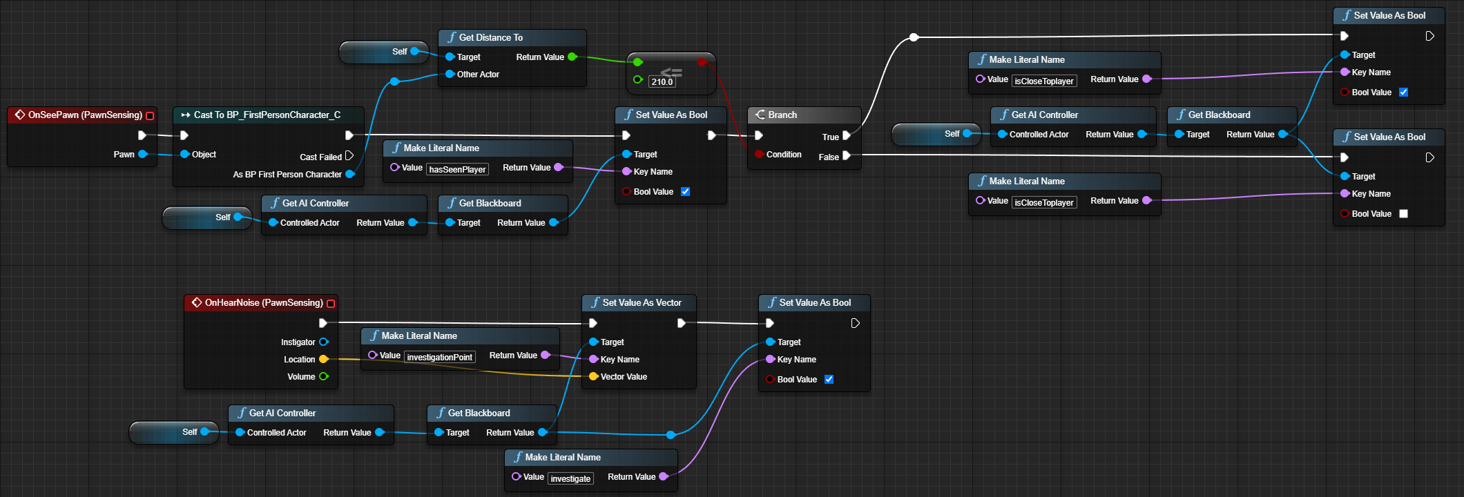 The second task I needed to do was an AI Bear. Where it can roam, chase and attack. It is a highly dangerous animal that if you encounter it, there is only a small chance for you to get away. The AI uses the Unreal Engine's Behavior Tree, where it switches between states affected by the player's interaction with it. For example, if the player comes into view or gets too close to the bear, its behavior will change.