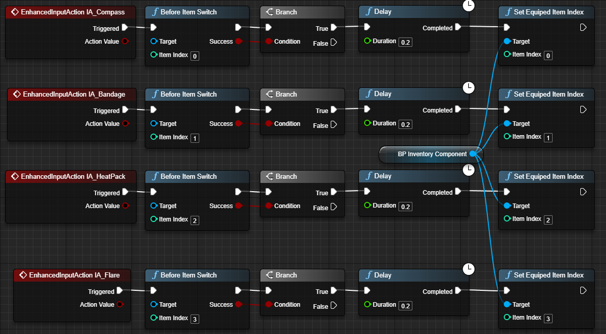 And the implementation in blueprints is done where when the player clicks keys 1 through 4, first it calls the "Before Item Switch" function where it just checks if an animation montage is playing and also does a hotbar flash. Then it continues to the "Set Equiped Item Index" where it just calls back to the "Equip Items To Hand" function where it handles the different states the item can be at, if it should switch the item to the new one or should it just unequip it and so on. It sends the an event message to the equipped item through an interface where it calls its own implementation of the item. Right bellow is a snipet of blueprint code of how the heatpack handles each case and also the "On Item Use" event call.